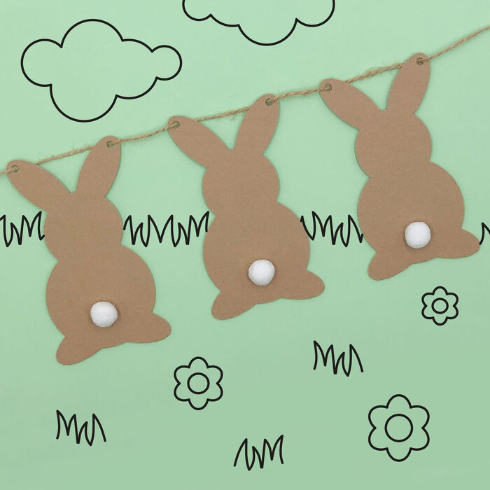 Crea delle decorazioni pasquali con dei simpatici coniglietti in cartone. MATERIALE: scatola in cartone, sagome, taglierino/forbici, colla, spago/nastro, pom pom, matita,...
