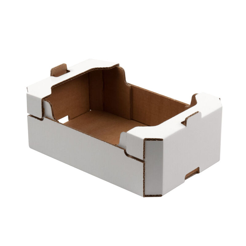 Tray with lid and moulded sides for medium-sized fruit and vegetable products such as apples, pears, citrus, and so on.